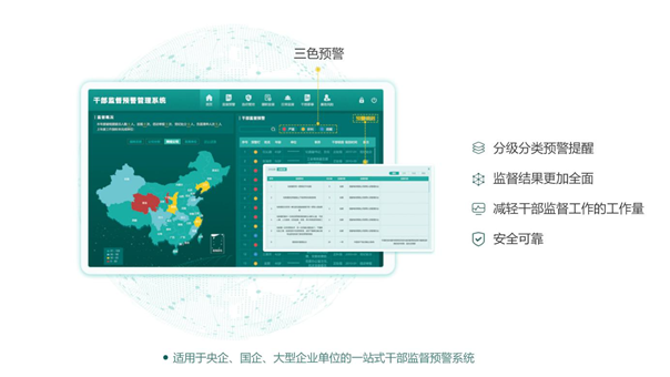 干部監(jiān)督預警系統(tǒng)是一款基于大數(shù)據(jù)思維的干部管理產(chǎn)品。該產(chǎn)品能夠靈活配置領導干部的監(jiān)督事項與預警規(guī)則,快速構建干部監(jiān)督評價模型,幫助政企單位進行干部選任、干部履職、日常工作、干部要事、輿情等業(yè)務的工作監(jiān)督,發(fā)現(xiàn)問題事項后可以根據(jù)嚴重程度進行“紅黃藍”三色預警提醒,通過顏色來識別干部“健康度”。該產(chǎn)品將海量干部監(jiān)督數(shù)據(jù)進行整合分析,大大減輕人工監(jiān)督工作量大、查閱工作繁瑣等痛點問題;前移干部監(jiān)督關口,及時發(fā)現(xiàn)苗頭性和傾向性的問題,輔助進行干部調整、班子建設等工作。