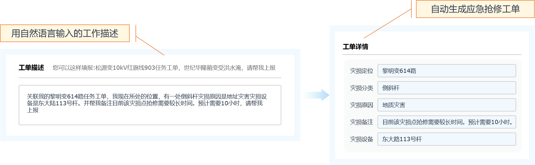 國網某省電力公司在電力應急災害搶修管理中,借助于智能填寫技術,實現了“用自然語言輸入一段工單描述,大模型提取其中的工單信息,并自動填入到工單中”的功能。