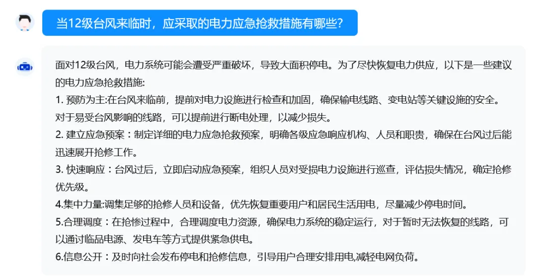 安全應急管理是電力企業生產運營的重中之重,面對海量法律法規、制度準則,工作人員往往難以準確掌握其中的細則要求?;诮瓞F代打造的智能問答大模型,國網某省電力公司實現了應急管理系統的24小時“智能問診”,工作人員在應急搶修過程中可隨時對行業規范要求、突發事件處理方案等進行提問,系統可以給出準確答案以及答案來源,比如“面對12級臺風,應該采取哪些應急搶修措施?”等。